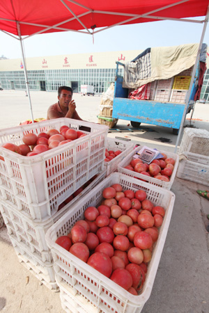 長年從事西紅柿批發(fā)行業(yè)的張廷祥對記者講,5000斤西紅柿對他這個(gè)批發(fā)小戶來說,“僅用兩天的時(shí) 間就會全部售光!倍锷绞卟伺l(fā)市場像他這種規(guī)模甚至規(guī)模還要大的西紅柿批發(fā)商就有70多戶。