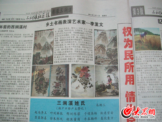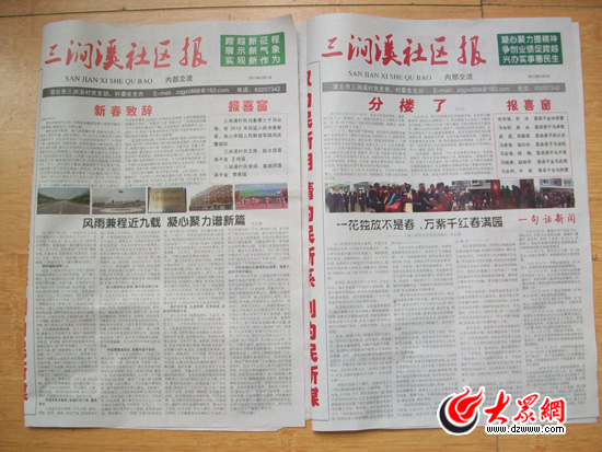 “新春賀詞、工作報告、報喜窗、書記訪談……”春節(jié)前后,章丘市雙山街道三澗溪社區(qū)(原三澗溪村)自辦的《三澗社區(qū)報》第四期陸續(xù)發(fā)到了社區(qū)的每家每戶。這張小小的社區(qū)報說的都是身邊的人,講的都是村里的事,投稿的“記者”也都是社區(qū)里的老百姓。大眾網(wǎng)記者了解到,社區(qū)報既是三澗溪社區(qū)政務(wù)公開的窗口,又是反映民情的平臺,還是社區(qū)居民展示才藝、吐露心聲的舞臺,因此成為全村人最搶手的報刊。