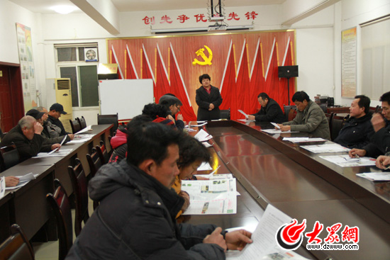 章丘市雙山街道辦三澗溪社區(qū)黨支部書記高淑貞帶領(lǐng)村民讀社區(qū)報。