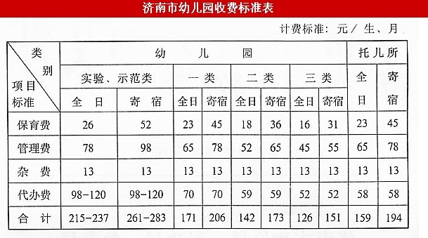 同時(shí),記者從濟(jì)南市物價(jià)部門了解到 ,按照《濟(jì)價(jià)費(fèi)字(2003)67號(hào)文》規(guī)定,濟(jì)南公辦幼兒園收費(fèi)標(biāo)準(zhǔn)為:全日制實(shí)驗(yàn)、一類、二類、三類幼兒園最高分別為237元、171元、142元、126元,全日托兒所為159元。而237元的收費(fèi)最高限,從2003年開(kāi)始至今,近十年未曾漲過(guò)。