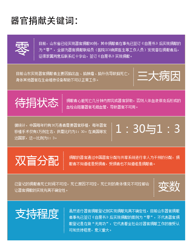 自2010年10月,山東省作為全國人體器官捐獻首批試點省啟動器官捐獻工作至今,一共實現(xiàn)器官捐獻90例,但是90例中,由捐獻者自己事先申請登記后實現(xiàn)捐獻的為“零”,全部是由醫(yī)院中的“聯(lián)絡員”——ICU病房的醫(yī)生等工作人員發(fā)現(xiàn)符合條件的潛在捐獻者,經(jīng)溝通后,由紅十字會工作人員去做家屬的工作,簽訂自愿書,最終實現(xiàn)了捐獻。