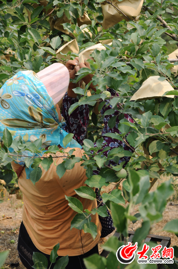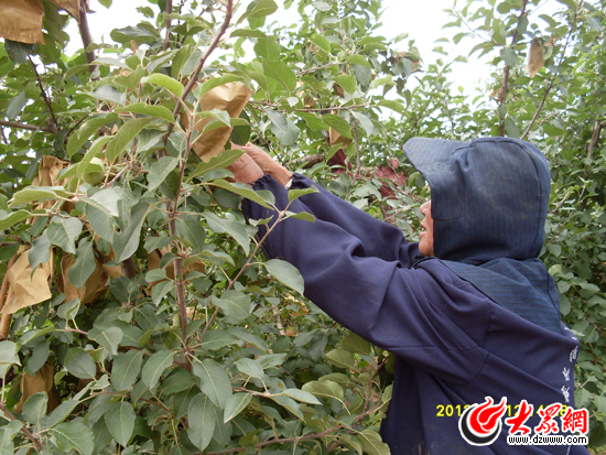 采訪中,記者了解到,蘋果套袋在蛇窩泊鎮(zhèn)果樹種植中有10多年的歷史了,套袋能促進果實全面著色,使果面潔凈,果皮細嫩。