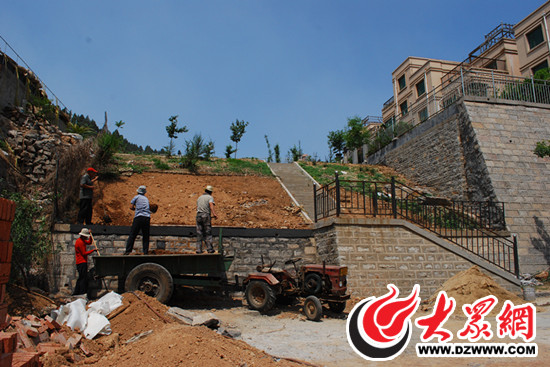 31日上午,記者在鳳鳴山莊三區(qū)現(xiàn)場(chǎng)看到,被挖護(hù)坡幾乎已經(jīng)看不出被破壞的樣子了,原先大坑的下方,一道擋土墻長(zhǎng)度約6米,寬為1.2米,高度為2米的擋土墻高高筑起,F(xiàn)場(chǎng)有四五名工人,正在把?康囊惠v拖拉機(jī)上的渣土往護(hù)坡上填埋,原先挖空的山體已經(jīng)接近被填實(shí),只是護(hù)坡磚還沒有砌上。