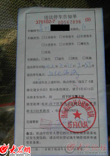 從網(wǎng)友上傳的圖片中,記者看到,被貼罰單的是輛掛有魯O牌照的白色警車,車門上噴有“司法”字樣。在違法停車告知單上,清楚的寫著:違法停車時(shí)間為2012年2月21日9時(shí)55分,違法停車地點(diǎn)為文化西路,單子下方還蓋有濟(jì)南市公安局交通警察支隊(duì)歷下區(qū)大隊(duì)的公章。