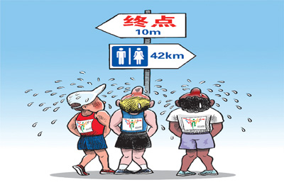 北京國際馬拉松賽上,沿途沒什么衛(wèi)生間,組織方提供的流動(dòng)廁所又少,很多選手被迫在賽道旁的墻根或綠化帶中解決,甚至有內(nèi)急的男同胞“占領(lǐng)”女廁。有市民表示,“成功的賽事,不單是賽事順利舉辦和成績的突破,還應(yīng)該有周到的服務(wù)和良好的氛圍”。