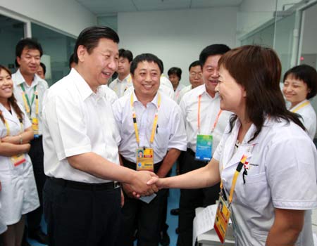BEIJING -- Chinese Vice President Xi Jinping called for a high-level Beijing Olympics by providing a secure environment, good media services and strict anti-doping work for the Games. Chinese Vice President Xi Jinping (C) shakes hands with a drug supervisor for the Olympic Games, in Beijing, capital of China, July 21, 2008. Xi inspected the security work, medias operation and drug supervision for the upcoming Olympic Games Monday. [Xinhua]