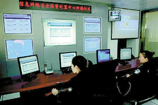6日下午,青島市公安局信息網(wǎng)絡(luò)安全報(bào)警處置中心正式開(kāi)通,有害手機(jī)短信息的受理和查處工作也同時(shí)展開(kāi)。據(jù)介紹,該處置中心將擔(dān)負(fù)起全市計(jì)算機(jī)信息網(wǎng)絡(luò)安全保護(hù)等任務(wù)。圖為民警在網(wǎng)絡(luò)上值勤。 (徐勇 張毅民)