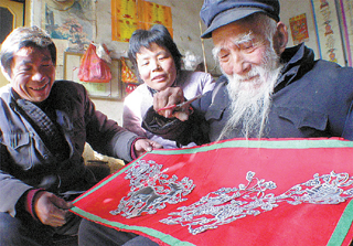 1月8日,兗州市嵫山村農(nóng)民剪紙藝術(shù)家王潤身(右)為鄉(xiāng)親刻剪麒麟送祥圖。他于2001年被兗州市文化部門授予“民間藝術(shù)家”榮譽(yù)稱號(hào)。近年來,隨著農(nóng)民生活水平不斷提高,山東農(nóng)村涌現(xiàn)出一大批“拿起鋤頭干農(nóng)活,放下鋤頭搞創(chuàng)作”的農(nóng)民藝術(shù)家,他們的作品具有濃郁的生活氣息和鄉(xiāng)土特色,受到人們的關(guān)注和喜愛。    新華社發(fā)