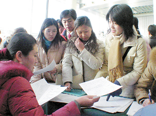 1月6日,求職人員在山東省濟(jì)南市人才交流中心登記有關(guān)資料。在山東省濟(jì)南市人才交流中心,工作人員將求職人員資料輸入專(zhuān)門(mén)的網(wǎng)絡(luò)系統(tǒng),使求職人員的信息在省內(nèi)各人才交流中心實(shí)現(xiàn)共享。山東省人事、公安、勞動(dòng)保障等各部門(mén)圍繞著促進(jìn)就業(yè)再就業(yè)工作多管齊下、密切協(xié)作,出臺(tái)了一系列相關(guān)政策和服務(wù)措施。2003年,山東省城鎮(zhèn)實(shí)現(xiàn)就業(yè)和再就業(yè)105萬(wàn)人,其中下崗失業(yè)人員再就業(yè)36萬(wàn)人,困難群體再就業(yè)7.5萬(wàn)人。