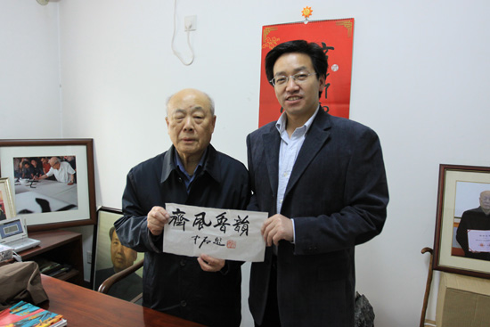 大眾網(wǎng)訊 4月18日,大眾網(wǎng)董事長(zhǎng)、總經(jīng)理林忠禮,頻道建設(shè)部主任張峰一行赴京,拜訪了我國(guó)當(dāng)代著名書法家、中央文史館館員歐陽(yáng)中石先生。會(huì)談中,林總就大眾網(wǎng)山東文化網(wǎng)絡(luò)平臺(tái)建設(shè)以及網(wǎng)站十周年慶典等事宜向中石先生征求建議,中石先生誠(chéng)懇地表示,自己愿意為家鄉(xiāng)的網(wǎng)絡(luò)文化事業(yè)做點(diǎn)事情,并親自為文史頻道題寫了“齊風(fēng)魯韻”的賀詞。