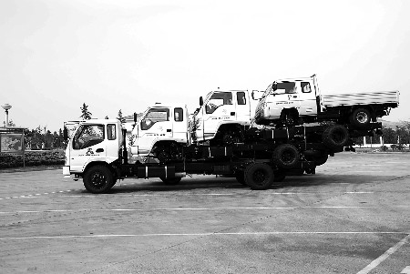 本報臨沂5月25日熱線消息 為了節(jié)省費(fèi)用,本來應(yīng)該分四次運(yùn)送的車,被一次“組合”在了一起——一輛車上裝載了三輛車。(左圖)