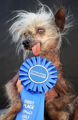 6月26日,在美國加利福尼亞州舉行了第21屆年度世界最丑狗比賽。最終,一只名叫Pabst的4歲丑狗榮獲冠軍。圖為一只名叫Ellie的小狗奪得純種犬項(xiàng)目的最丑冠軍。