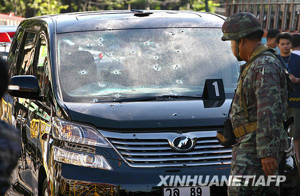 據(jù)泰國電視臺報(bào)道,乘車出行的頌提在曼谷ASTV電視臺附近遭一伙不明身份人員襲擊。他們先將車胎擊破,隨即向車內(nèi)開槍。