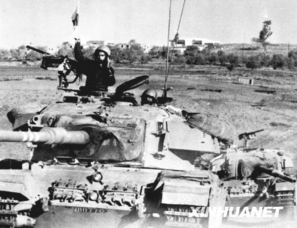 1967年6月5日,以色列向埃及、敘利亞和約旦發(fā)動大規(guī)模的突然襲擊,第三次中東戰(zhàn)爭爆發(fā)。戰(zhàn)爭于6月11日結(jié)束。在這次戰(zhàn)爭中,以色列侵占了巴勒斯坦的約旦河西岸、加沙地帶、耶路撒冷城的約旦管區(qū)、埃及的西奈半島和敘利亞的戈蘭高地,共達6.57萬多平方公里的阿拉伯土地,使近50萬阿拉伯人淪為無家可歸的難民。在美、蘇等大國操縱下,聯(lián)合國安理會在同年6月7日和8日兩次通過“;饹Q議”,埃及、敘利亞和約旦在喪失大片土地的情況下,被迫接受無條件“停火”。這是以色列的坦克部隊正向戈蘭高地上的敘利亞陣地進攻。