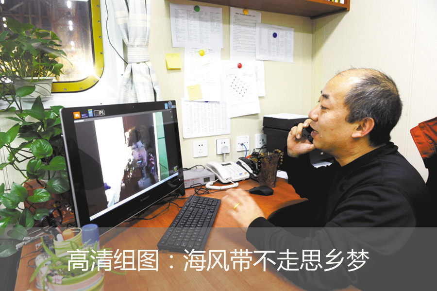 晚上8點(diǎn),新勝利鉆井一號(hào)平臺(tái)的經(jīng)理室里,趙忠生與妻子通過(guò)網(wǎng)絡(luò)視頻聊天,因?yàn)榫W(wǎng)絡(luò)、手機(jī)信號(hào)質(zhì)量都不好,所以他同時(shí)撥通手機(jī)輔助交流。