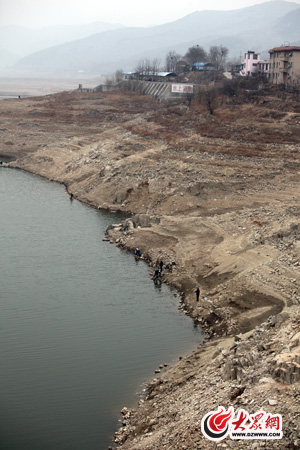 站在錦繡川水庫大壩之上向東望去,往日浩渺的水庫風采不見,南北兩岸巖石壁上明顯保留著水位退卻時的一條條水痕。在接近水面的庫灘上,坐著一位位垂釣者。水庫辦公室主任劉春平看著眼前的情景無奈地說:“水少了,游客比往年少了許多,但水淺時正是魚多好釣的時候,因此釣魚者也就多了!