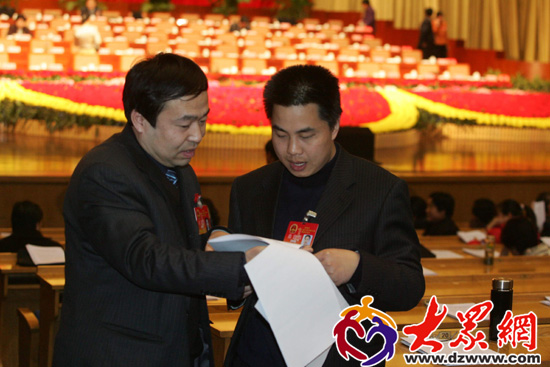 在濟(jì)南市第十三屆三次人代會上,張剛代表(右)與其他代表商議欲提交的方案。(周青先攝)