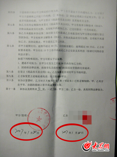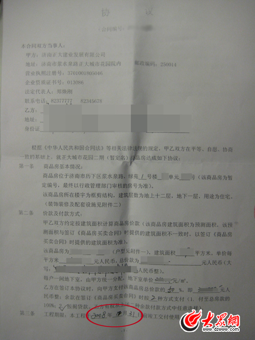張先生告訴記者,他于2007年1月跟正大城市花園簽訂購房協(xié)議,購買2期的5號樓(原為綠苑1號樓),當(dāng)時(shí)該樓并沒有預(yù)售證,不過開發(fā)商承諾會很快辦理,于是張先生就簽訂了購房協(xié)議,協(xié)議里約定:2008年12月31日之前交付使用。在之后幾個(gè)月里,張先生發(fā)現(xiàn)他買的樓遲遲沒有動工,就詢問開發(fā)商:自己的樓何時(shí)能開工?開放商對此解釋說,要先蓋早賣出樓盤,張先生的樓盤賣得晚,當(dāng)然要蓋得晚。