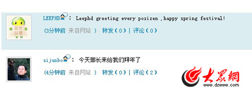 大眾網(wǎng)濟(jì)南2月10日快訊 今天上午10時(shí),山東省委常委、宣傳部長(zhǎng)李群來(lái)到大眾網(wǎng),看望、慰問(wèn)網(wǎng)站采編人員,并通過(guò)大眾網(wǎng)向廣大網(wǎng)民致以新春的問(wèn)候。今天,大眾網(wǎng)眾眾微博正式上線,李群部長(zhǎng)欣然在眾眾微博上開(kāi)通個(gè)人博客,向廣大“脖子們”問(wèn)好,祝廣大網(wǎng)友春節(jié)快樂(lè)!