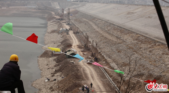 在水庫(kù)壩底,幾十名工人正在緊張忙碌著,一架塔吊不時(shí)吊著路面上的架管至壩底