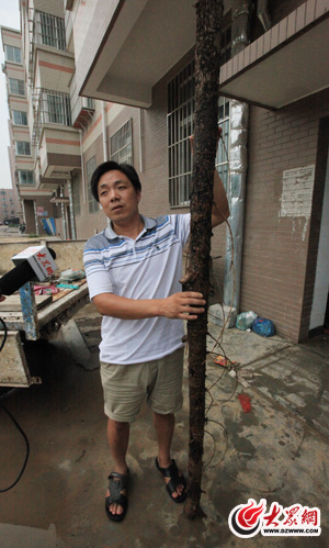 在受災(zāi)最嚴重的9號樓二單元,一些居民七手八腳的抬來一根長木頭測量水深。當木頭抬出水面時,大家才發(fā)現(xiàn)水位痕跡比一人都高,水深足有2米。