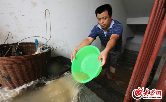 居民在地下室入口淘水自救