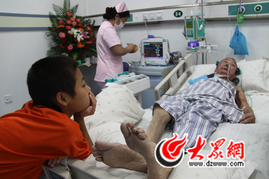 鄭老躺在病床上,他收養(yǎng)的孩子伏在床邊看著他