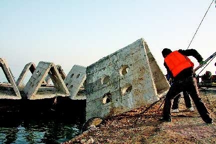 9日上午7點(diǎn),黃家塘碼頭,一輛大吊車(chē)正將重達(dá)2噸的三角大件人工魚(yú)礁穩(wěn)穩(wěn)當(dāng)當(dāng)?shù)匕嵘洗?點(diǎn)半,在“嗚嗚”的馬達(dá)聲中,兩艘船一齊駛向碼頭東北方向4公里處。船上的工人將20塊人工魚(yú)礁投入大海,濺起大片水花。據(jù)介紹,這是今年的第22次人工魚(yú)礁投放。