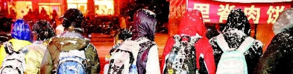 15日,煙臺(tái)解放路上剛剛放學(xué)的學(xué)生在雪中買(mǎi)肉餅。本報(bào)記者郭建政攝