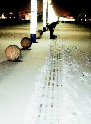 15日晚,煙臺(tái)濱海廣場(chǎng)上的值班人員在清理盲道上的積雪。郭建政攝