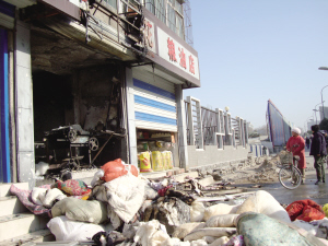 失火門店的門口堆滿了被搶出來的棉被