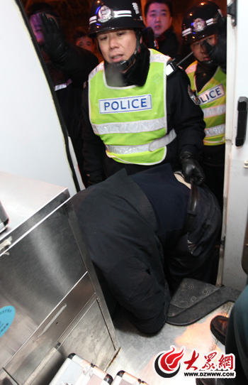 兩位頭戴鋼盔的民警試圖用力將其架進(jìn)車倉,而該名男子卻一直蒙頭遮面,如一塊泥巴粘在車門口附近,兩 位民警再怎么用力也無濟于事。經(jīng)民警苦口勸解,該男子方同意接受了血液檢測。