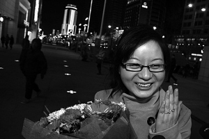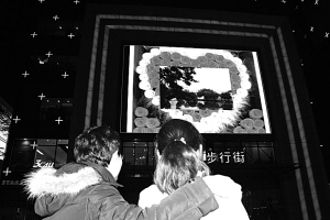 小謝:呵呵……這個(gè)過(guò)程還有些小曲折呢。原定求婚的時(shí)間是11日,一直拖到現(xiàn)在才定下來(lái),從有這個(gè)想法開(kāi)始,預(yù)想過(guò)無(wú)數(shù)次女朋友看到的情景:她不經(jīng)意的走過(guò)去,一看大屏幕上竟然播放的是男友向自己求婚的畫面,到時(shí)候,我再把戒指一掏,鮮花一遞……她肯定會(huì)很高興的。謝謝捧場(chǎng)的陌生朋友。