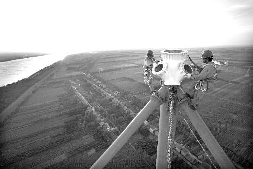 施工人員在進行鐵塔組立。 徐可 攝 (資料片)