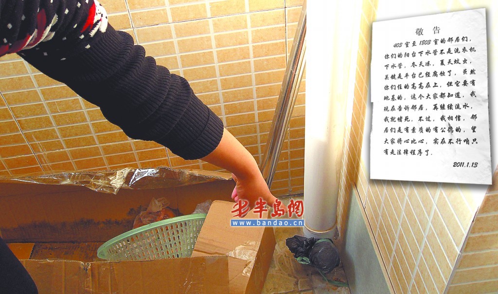 1月26日,潘先生給本報打來電話說:“裕環(huán)路90號樓下貼了個告示,說是因為樓上在陽臺上使用洗衣機,把水都排到了樓下住戶的窗戶外面,冬天凍,夏天蚊蟲,給樓下的居民造成了很大的不便!迸讼壬嬖V記者,“最后還寫著:實在不行咱只有走法律程序。”