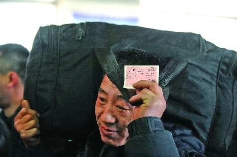 29日,濟(jì)南火車(chē)站,一位在濟(jì)南打工的牡丹江乘客拿著自己好不容易獲得的車(chē)票上車(chē)。