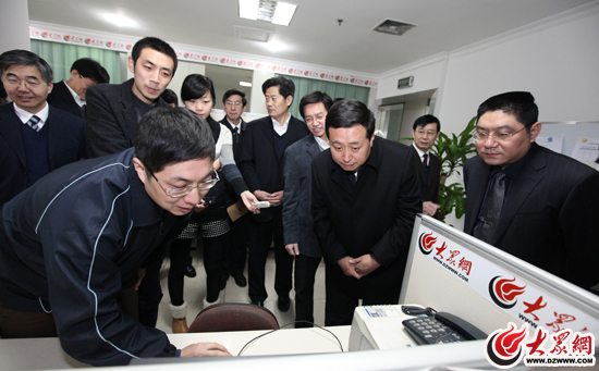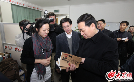 1月31日,山東省委常委、宣傳部長(zhǎng)孫守剛在常務(wù)副部長(zhǎng)姜鐵軍,副部長(zhǎng)徐向紅,副巡視員王世農(nóng)等省委宣傳部領(lǐng)導(dǎo)以及大眾報(bào)業(yè)集團(tuán)黨委書記、董事長(zhǎng)、總編輯傅紹萬,大眾報(bào)業(yè)集團(tuán)社長(zhǎng)、黨委副書記許衍剛,大眾報(bào)業(yè)集團(tuán)黨委副書記、副總編輯李壯利,大眾報(bào)業(yè)集團(tuán)黨委常委、副總編輯魏武,趙念民,郝克遠(yuǎn)等領(lǐng)導(dǎo)陪同下,來到大眾網(wǎng)檢查指導(dǎo)工作,看望慰問網(wǎng)站工作人員,并通過大眾網(wǎng)向廣大網(wǎng)友拜年。(記者 曹亮 攝)