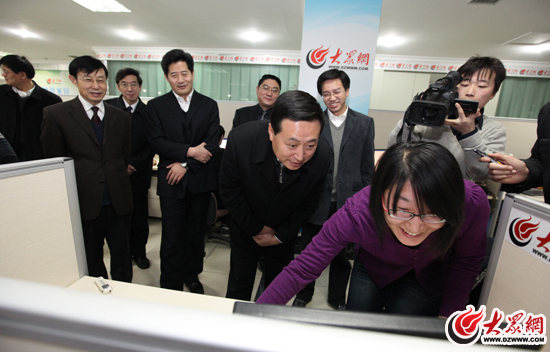 孫守剛一行先后參觀了大眾網(wǎng)宣傳欄、文化墻以及辦公區(qū)。在網(wǎng)站辦公區(qū),他向節(jié)日期間堅(jiān)守在崗位上的大眾網(wǎng)員工拜年。孫守剛詳細(xì)了解了大眾網(wǎng)組織架構(gòu)、地方分站、論壇服務(wù)管理、手機(jī)報(bào)、微博、編輯中心等工作流程,大眾網(wǎng)董事長(zhǎng)、總經(jīng)理林忠禮,大眾網(wǎng)總編輯朱德泉分別介紹了有關(guān)情況。孫守剛對(duì)大眾網(wǎng)的各項(xiàng)工作表示了肯定。