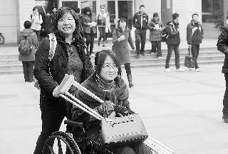 2月20日,在山東大學(xué)中心校區(qū)“北約”考點(diǎn),來(lái)自淄博七中的黃英劍坐著輪椅前來(lái)參加“北約”的考試。一個(gè)半月前她的左腿不幸摔傷,但依然堅(jiān)持參加了這次考試。
