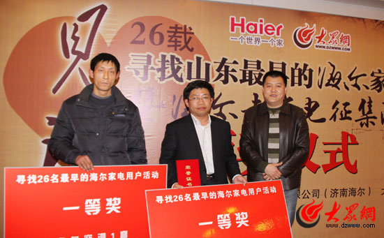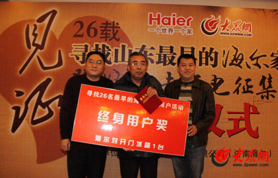大眾網(wǎng)濟(jì)南2月27日訊(記者 趙新婷)2月27日下午,由大眾網(wǎng)聯(lián)合濟(jì)南海瑞祥工貿(mào)有限公司(濟(jì)南海爾)共同發(fā)起的“尋找山東最早海爾家電用戶暨海爾老家電征集活動(dòng)”頒獎(jiǎng)儀式在山東新聞大廈舉行。歷經(jīng)21天的作品征集及嚴(yán)格的篩選和評定后,濟(jì)南海爾轄區(qū)(濟(jì)南、淄博、泰安、萊蕪、聊城、德州、東營、濱州)范圍內(nèi)的26名最早海爾家電用戶從500多幅作品中脫穎而出,其中大眾網(wǎng)網(wǎng)友江書莊憑借1985年出廠正在使用的“按聯(lián)邦德國利勃海爾許可證由中國青島電冰箱總廠制造”的琴島-利勃海爾電冰箱奪得終身用戶大獎(jiǎng)。