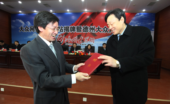 大眾網(wǎng)董事長、總經(jīng)理林忠禮(左)向德州市委宣傳部常務(wù)副部長趙泉江(右)頒發(fā)大眾網(wǎng)德州記者站名譽站長聘書。