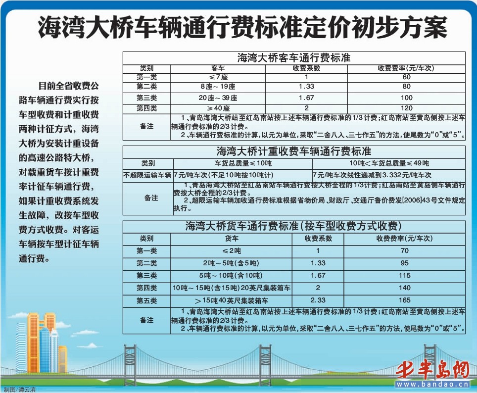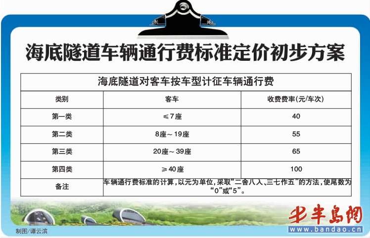 5月25日,市物價局發(fā)布了海灣大橋、海底隧道車輛通行收費(fèi)標(biāo)準(zhǔn)定價初步方案,根據(jù)初步方案 ,海灣大橋、海底隧道對客運(yùn)車輛都按車型計(jì)征車輛通行費(fèi)。而車型又分為≤7座、8座~19座、20座~39座、≥40座四類。