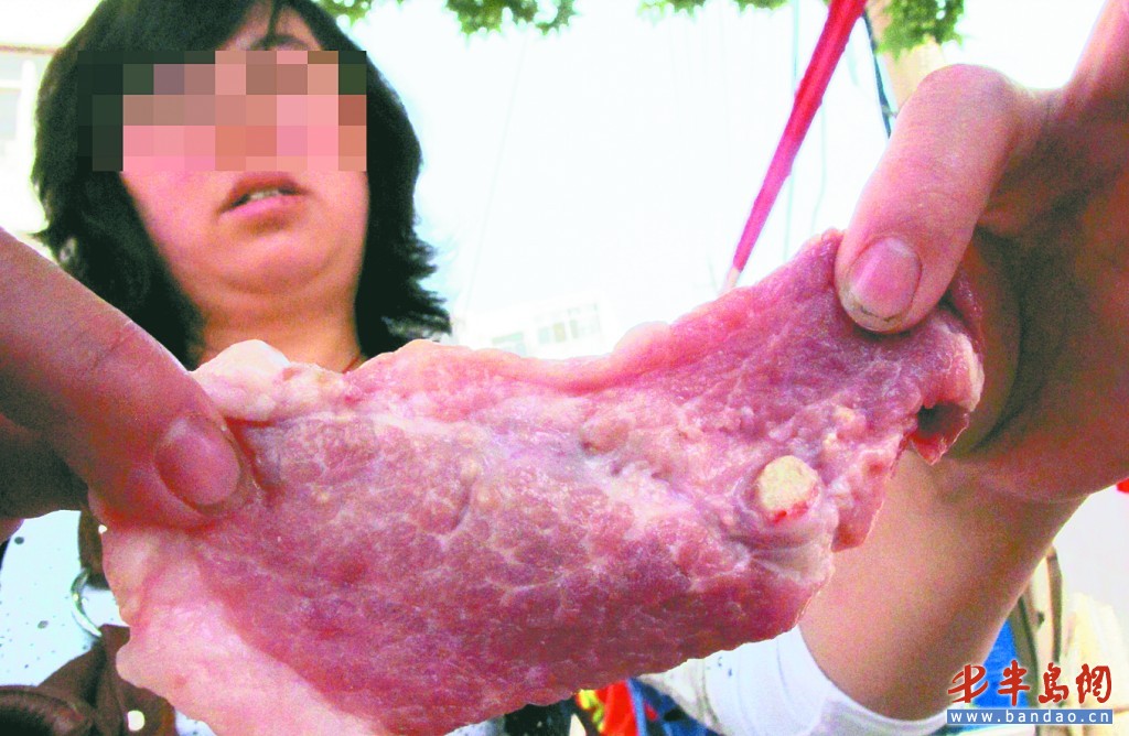 鮑福玉 來源:半島網(wǎng)-半島都市報[提要] 市民李女士5月31日從寧夏路上的大潤發(fā)超市購買了600余克生豬肉,回家切割時發(fā)現(xiàn)上面密布著米黃色顆粒,而且還有膿包狀物體,李女士感覺這些肉像米豬肉,質疑超市檢測成走過場。