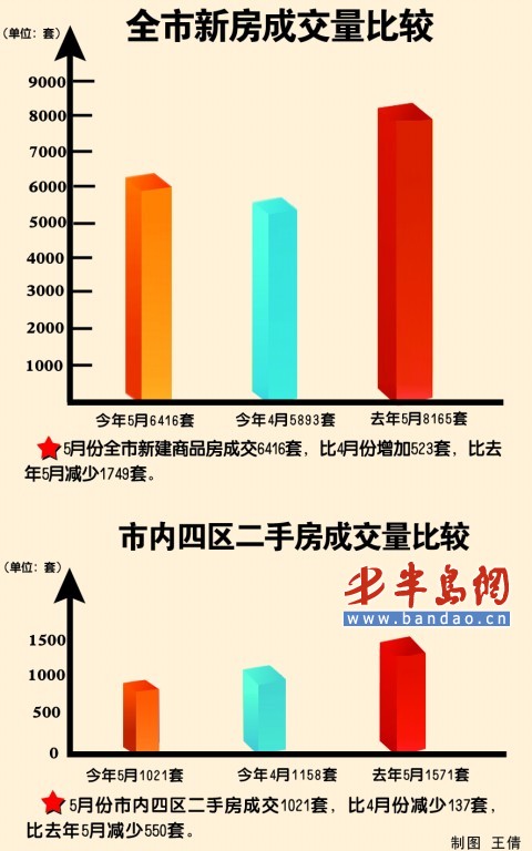王愛科 來源:半島網-半島都市報[提要] 樓市成交量在緩慢回升,但依然顯得不景氣,市內四區(qū)交易量尤其冷清。6月1日上午,青島市房地產交易中心公布了5月份房地產市場運行情況 。全市新建商品房住宅共成交6416套 ,較 4月份增加了 523套 ,但較去年同期減少了 1749套,同比跌幅達21% 。二手房方面 ,5月份市內四區(qū)二手房簽約量僅為1021套 ,比4月份減少了137套 ,比去年5月份減少了550套 ,同比跌幅達35%。業(yè)內人士稱,很多小中介因為好幾個月賣不出一套房子,已紛紛關門歇業(yè)。