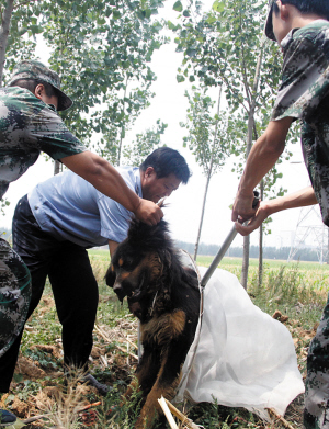 孫曉偉 劉暢 來源:山東商報[提要] 6月28日下午,再次發(fā)現藏獒行蹤的派出所民警,在吹管、麻醉針都相繼上場的情況下,仍舊未能將其抓住。在距離藏獒一百米左右距離,選定射擊位置后,只見神槍手趴在地上,瞄準之后,“砰”,一聲清脆的槍聲響起,藏獒應聲而倒。