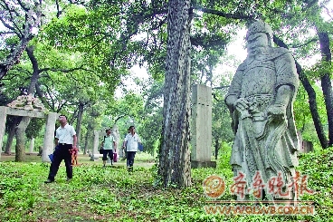 普查人員走過(guò)孔林中豎立的一尊石像。 本報(bào)記者 張曉科 攝