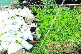 在漁船上,工人將打撈上來的滸苔裝袋。楊同玉 攝