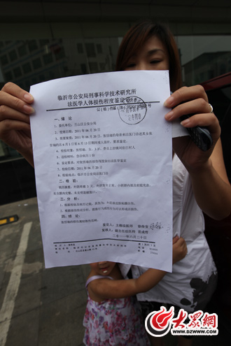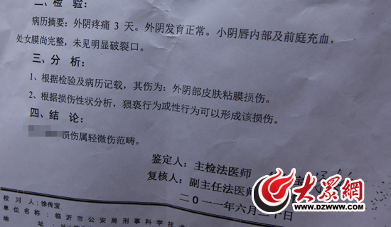 7月13日,朱女士向大眾網(wǎng)記者講述了事情經(jīng)過。她向記者出示了孩子入托時的發(fā)票,并出具了法醫(yī)鑒定結(jié)果。白紙黑字醒目地寫著:“外陰部皮膚粘膜損傷;根據(jù)損傷性狀分析,猥褻行為或性行為可以形成該損傷!甭淇钍牵号R沂市公安局刑事科學(xué)技術(shù)研究所。