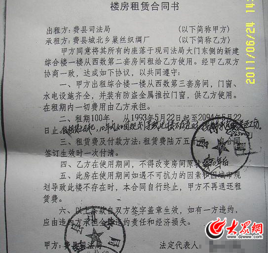 臨沂一司法局被曝最牛租房合同 收百年房租