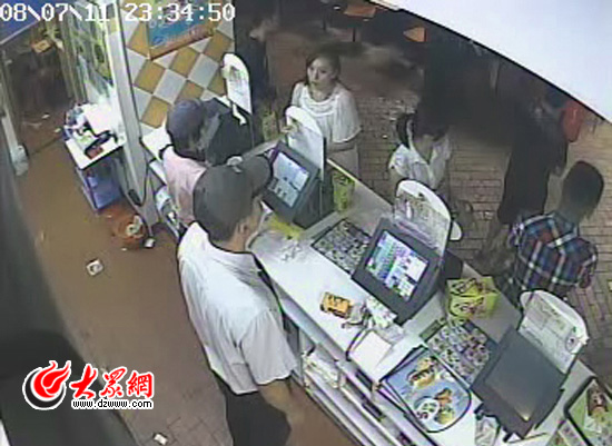 在視頻剛剛開始,即2011年7月8日23點34分51秒(監(jiān)控顯示時間,下同)時,被打的三名消費者站在肯德基店門口,他們面向店門,似乎正在與人爭吵。其間,一位身著白色上衣的女消費者一直在打電話。
